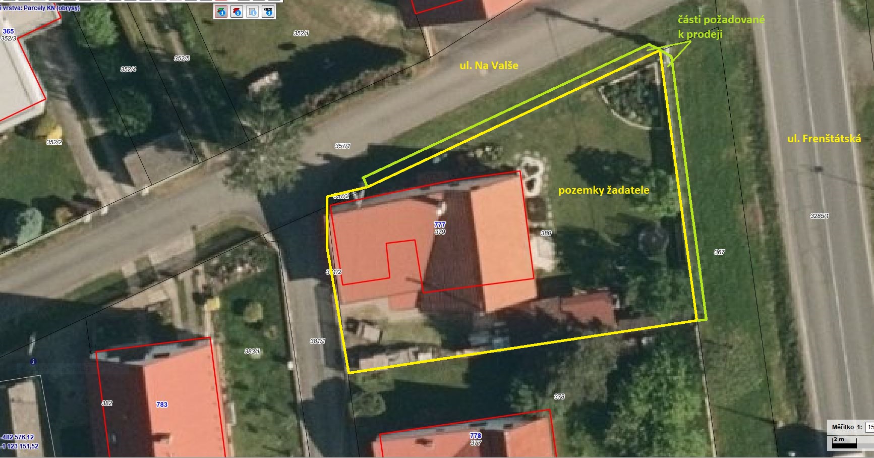 Rada města předkládá zastupitelstvu města k projednání žádost pana Rostislava Váského, ░░░░ ░░░░ ░░░░ ░░ , ze dne 03.04.2025. Předmětem podání je žádost o prodej částí pozemků parc. č. 357/1 ostatní plocha-ostatní komunikace a parc. č. 367 ostatní plocha-zeleň, oba v k. ú. Příbor. Jedná se o pásovité části pozemků o celkové výměře 45 m2 přiléhající k severní (ul. Na Valše) a východní (ul. Frenštátská) hranici pozemku parc. č. 380, který je ve vlastnictví žadatele.