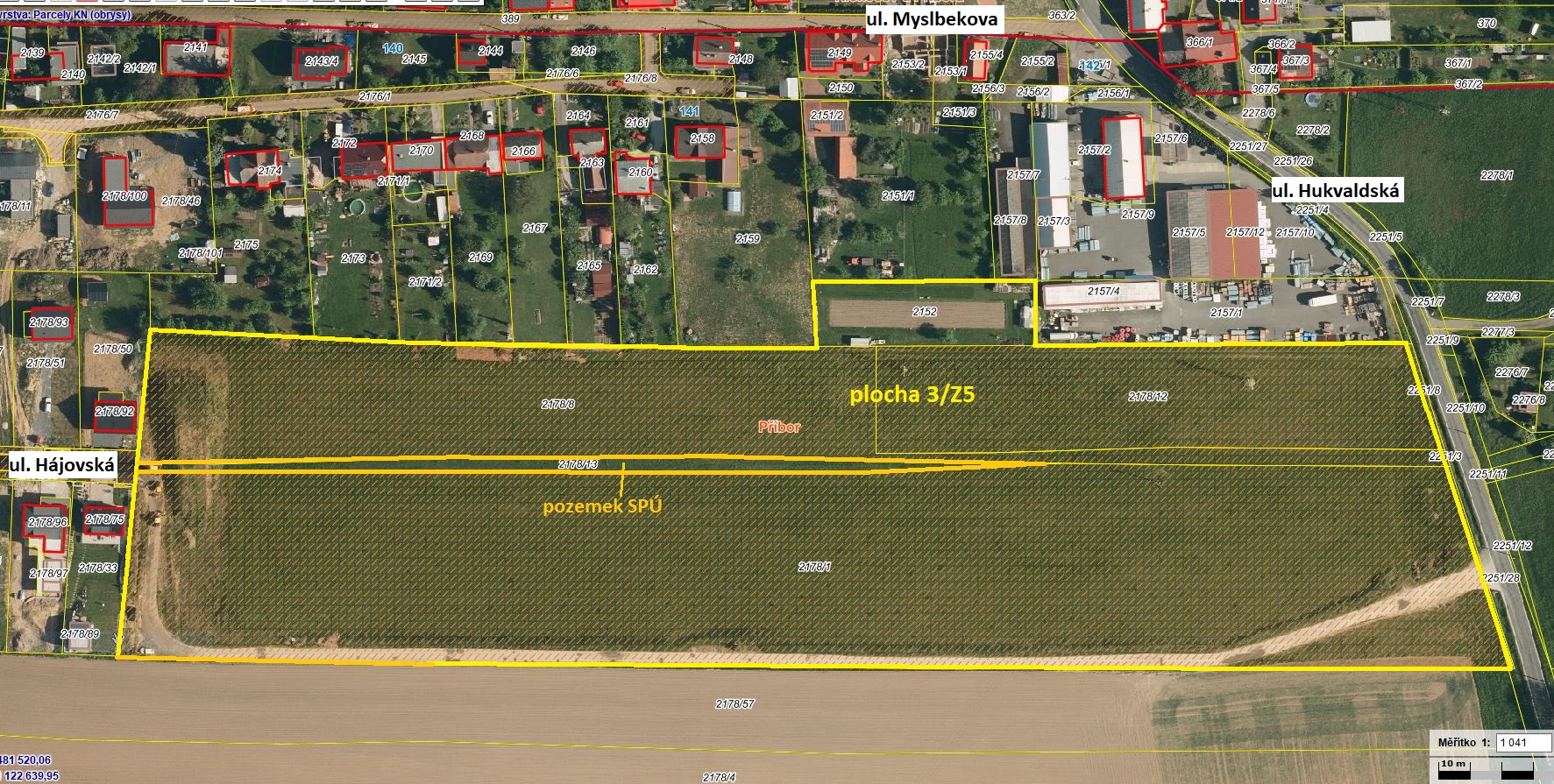 Z celkové výměry pozemku činící 1 026 m2 je pro zastavěnost komunikacemi vč. chodníků navrženo 78,88 m2 a pro veřejná prostranství-zeleň 97,37 m2. Zbylá výměra 849,75 m2 je rozčleněna do ploch stavebních pozemků. Zástupci odboru IRSM vyvolali počátkem loňského roku jednání na krajském pracovišti SPÚ v Ostravě. Předmětem schůzky s ředitelkou krajského pracoviště bylo zjištění podmínek pro převod pozemku do vlastnictví města. Z jednání vyplynulo, že vzhledem ke skutečnosti, že podstatná část předmětného pozemku bude rozčleněna do stavebních pozemků, které budou následně předmětem prodeje, je jedinou možností směna požadovaného pozemku za odpovídající pozemek/pozemky z majetku města, za podmínek stanovených SPÚ. V návaznosti na toto jednání a po předběžné konzultaci s vedením města (Ing. Majer, místostarosta) podal odbor IRSM dne 19.07.2024 2024 žádost o směnu pozemků, kde v souladu s podmínkami SPÚ nabídl ke směně odpovídající výměru (poměr výměr ke směně 1:1,4 ve prospěch SPÚ), a to pozemek parc. č. 168/3 v k. ú. Hájov o výměře 2 352 m2. Tento pozemek splňoval i další podmínky pro směnu - pozemek v souvislé zemědělské ploše vhodný i samostatně k realizaci zemědělské prvovýroby, bez porostů, staveb a jiných omezení. Dne 05.08.2024 obdržel odbor IRSM vyrozumění SPÚ, že probíhá revize procesu směn a do nastavení nových pravidel směn pozemků je vyřízení žádosti pozastaveno.